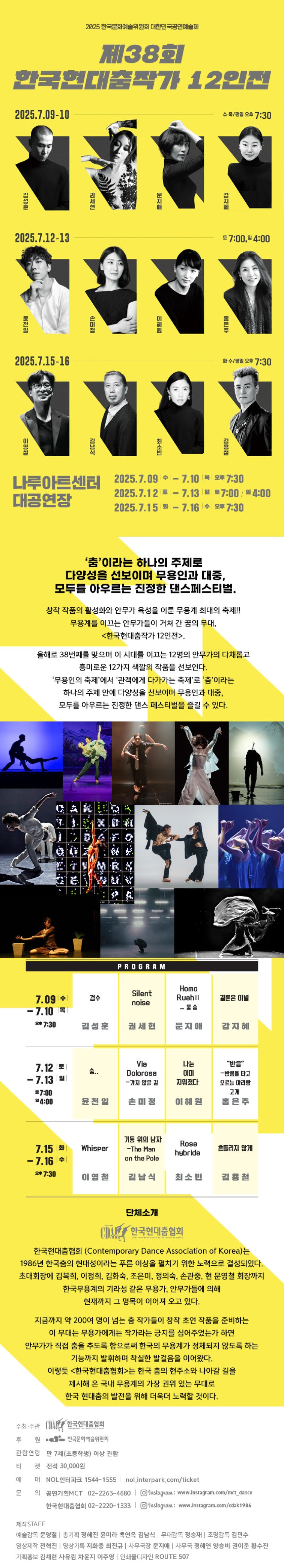 무용계의 실험적 작가 정신의 고양과 무용예술의 발전 및 활성화를 위해 지난 87년부터 진행되어 온 <제38회 한국현대춤작가 12인전>이 2025년 7월, 나루아트센터 대공연장 무대에 12명의 안무가의 작품을 선보입니다.